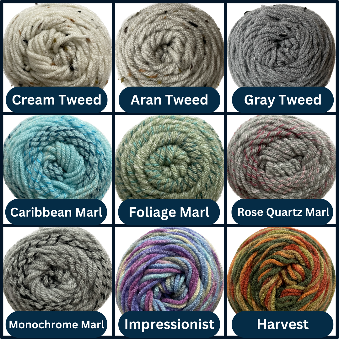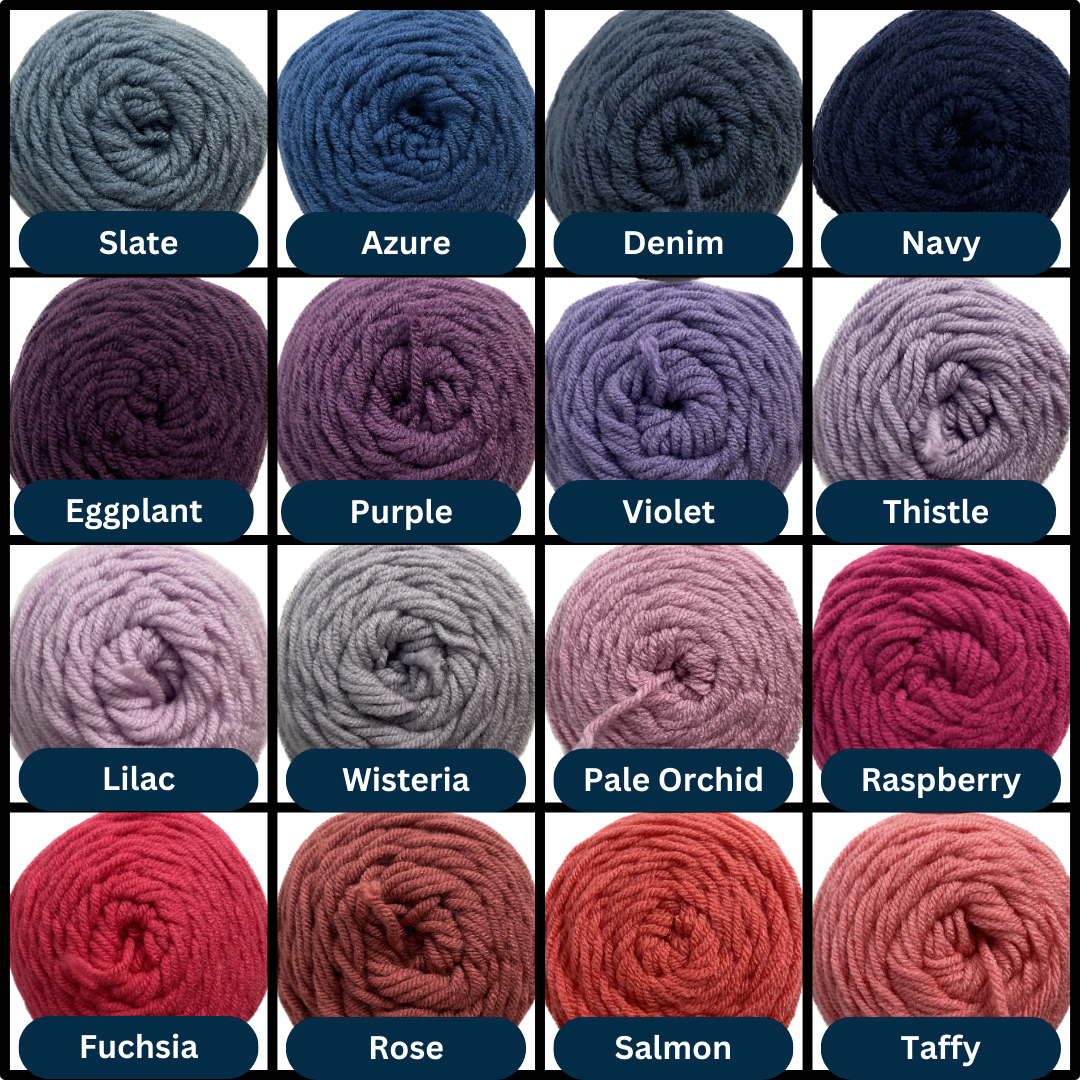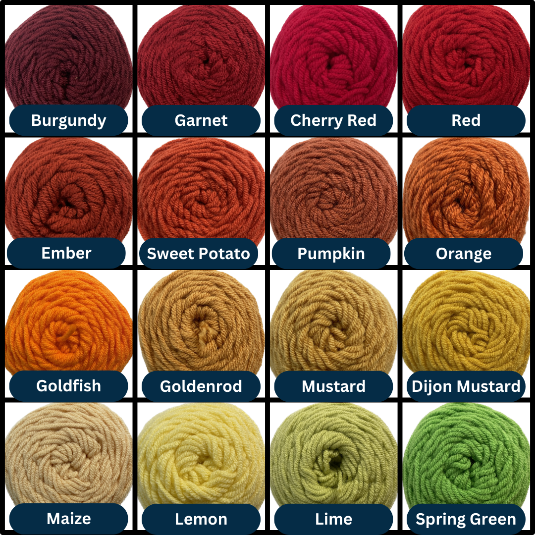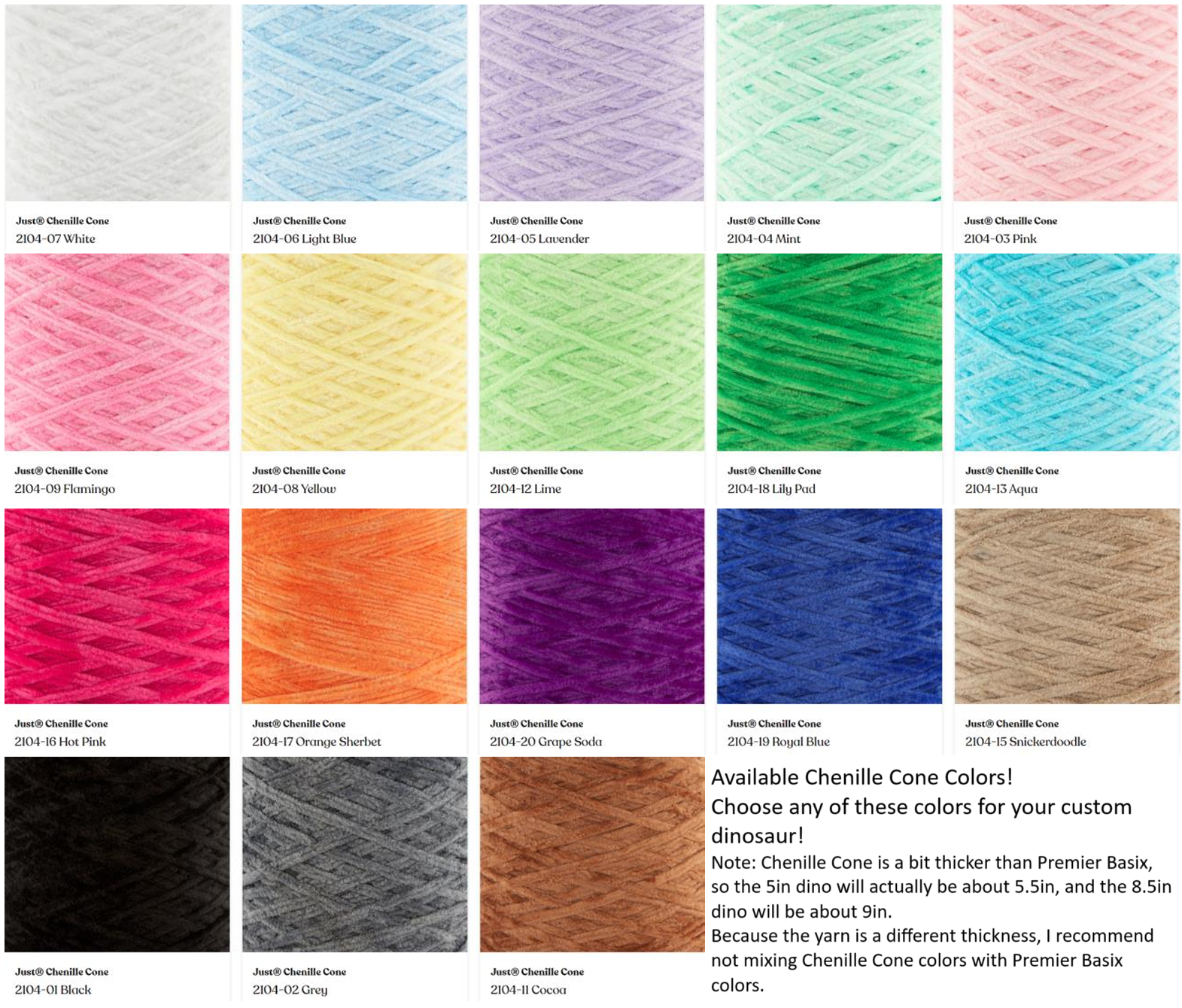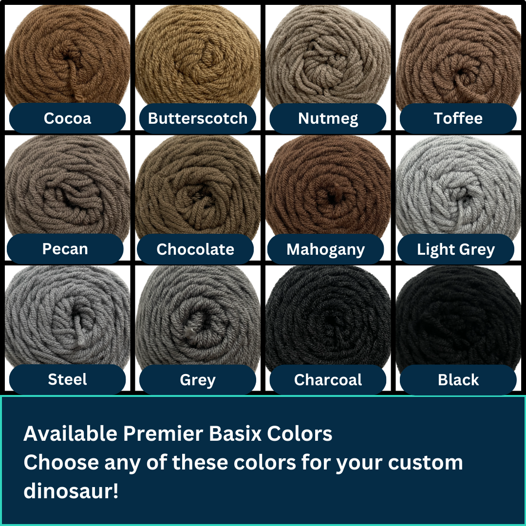 I use Premier Basix yarn which comes in 94 colors you can choose from! If you would like a chenille dino, I offer 18 colors of chenille! (Because the chenille yarn is a different thickness from the Basix yarn, I recommend not mixing chenille colors with Basix colors.)
